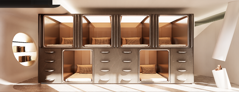 超大坪數空間通常會有多間客房,但這個案子為了整體空間動線不被中斷,因此並未多作隔間,設計師提出了大膽的想法,將膠囊旅館裝進空間中,一方面真的在有需求時客人可留宿,一方面充滿未來太空艙感的設計,既是此空間一大亮點,也會成為客人眼睛為之一亮的話題!本來頂多隔出兩間客房的空間,頓時擁有 6 個床位,而且膠囊還可兼具隔絕與隱私,戲劇與實用兼具。
