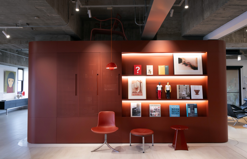 整體空間以灰色混凝土牆為基調,搭配紅色書牆構築主視覺。沒有制式客廳,中央是一個可自由變化的場域,白天可會客,夜晚則能舉辦餐會、讀書會或瑜伽課。家具幾乎都能移動,讓空間隨著需求任性轉換。