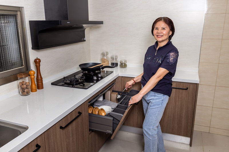 翻新結果讓媽媽驚喜萬分,「以前很多東西我都拿不到,新的廚房剛剛好,使用完全不費勁!」Lion媽媽臉上掛著笑意說,「而且翻新後空間燈光明亮、通風好,用完隨手擦就乾淨,真的很方便。」