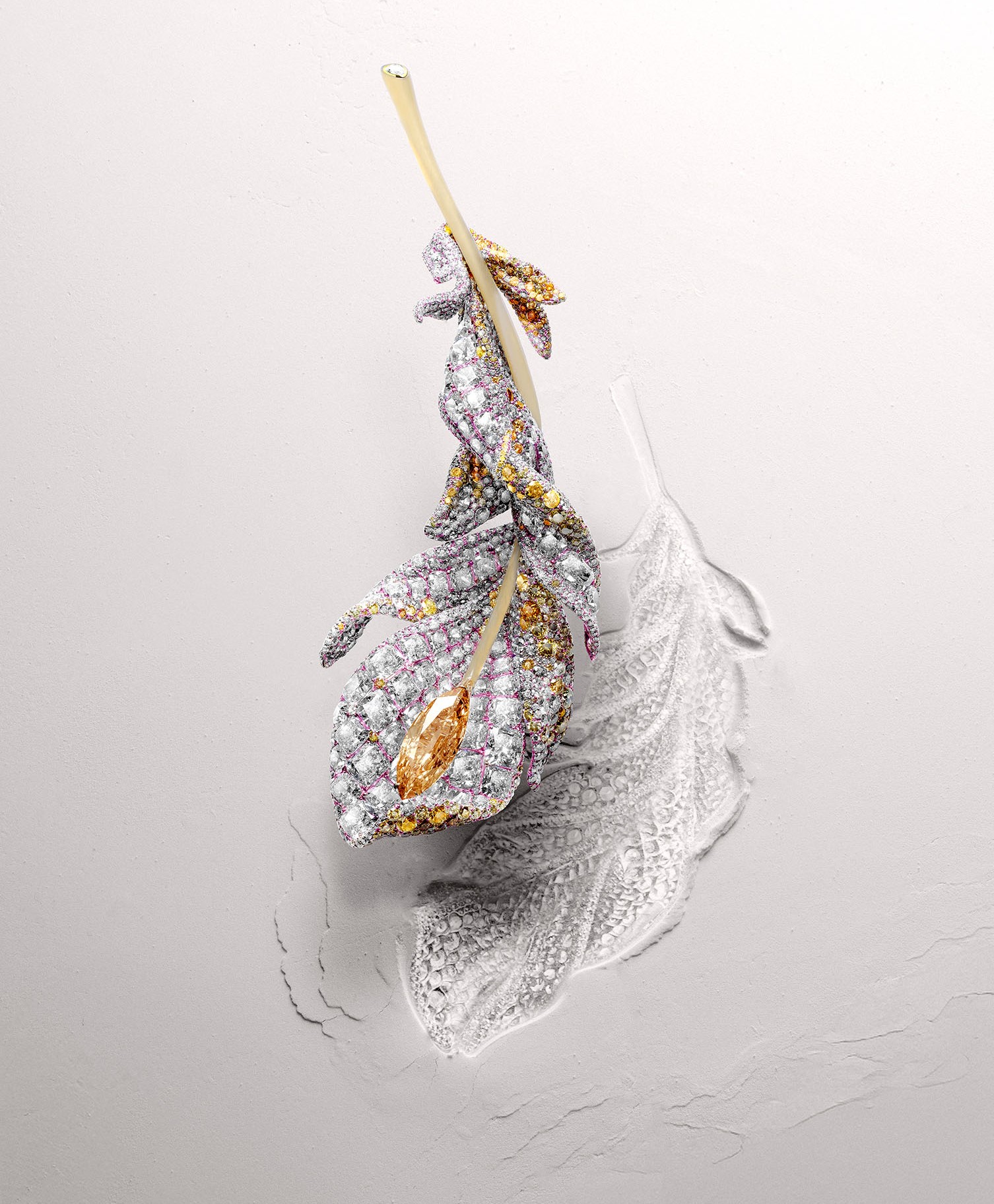 羽毛胸針用另一種飄然的方式呈現柔,更加體現Cindy當下「輕如鴻羽」輕盈自信的創作心境,此刻對於生命與藝術的體悟不同於以往,開始以「減法」創作藝術珠寶,透過精煉的線條與結構,展現歷經二十年沉澱後的自信與內斂。這股內斂卻藏不住鋒芒的璀璨在全新「羽毛胸針」系列中嶄露無遺。Cindy推敲每一根羽絨的姿態與旋轉角度,透過180度的立體扭轉,呈現羽毛隨風飄舞的靈動感以及蓬鬆而飽滿的姿態。雙面鑲嵌的寶石結構亦突破傳統,展現流動的立體美感。