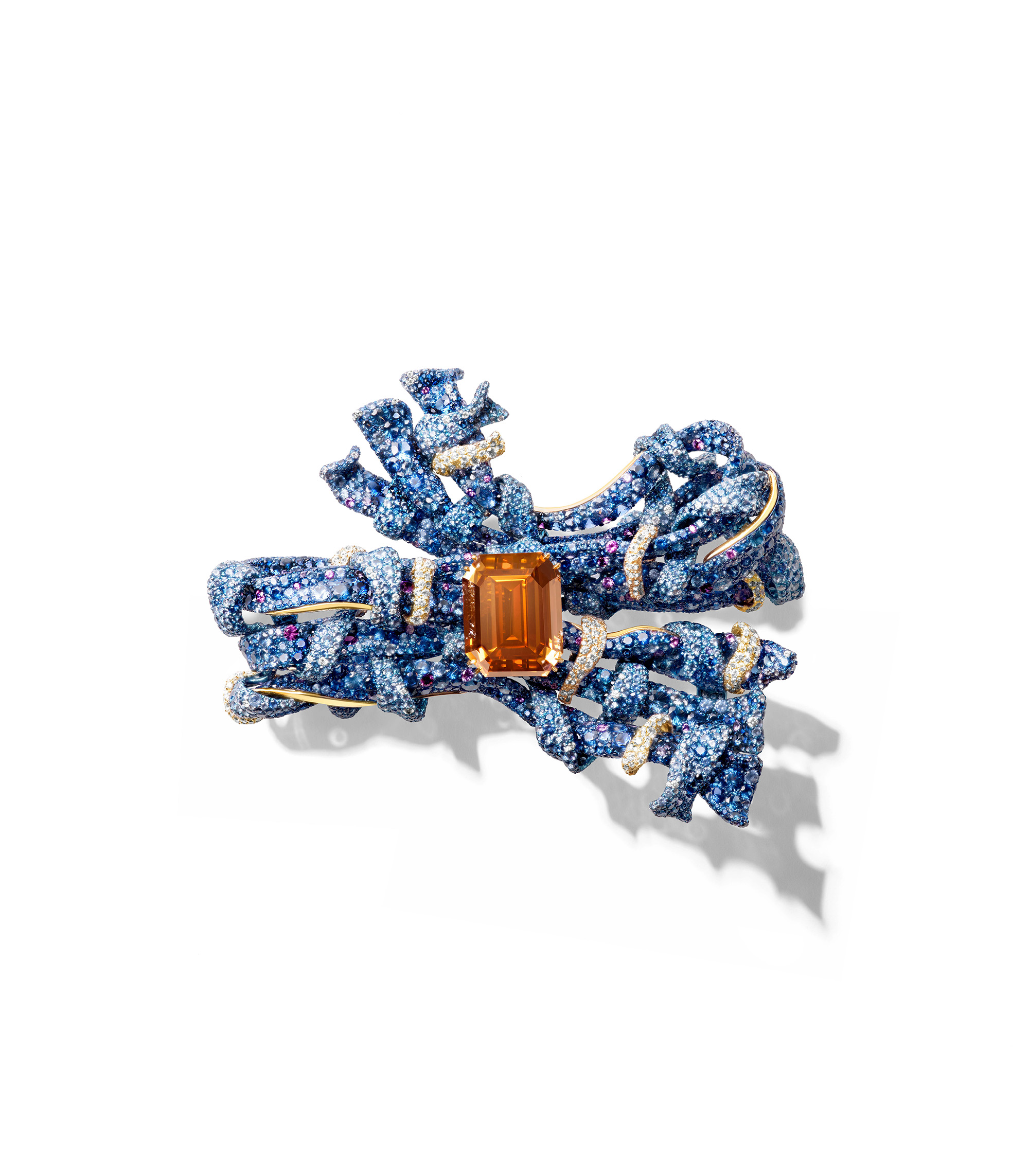 2025大師系列「編織胸針」則以人類最古老的工藝之一「編織」展現布料般柔軟的靈動飄逸。Cindy受高訂服飾手工呢絨的觸感所啟發,歷經三年構思創作這件作品。由於鈦金屬無法以傳統方式編織,她與歐洲工匠共同研發全新的結構技術。先以46條方向不一的鈦金屬絲帶構成,每一條絲帶單獨進行金屬塑形,並以超過6,700顆寶石鑲嵌與色彩漸層的處理,再橫向、縱向與斜向交織出立體層次。最終進行組裝,呈現出宛如無縫編織的錯覺。胸針中央重達25克拉、VVS2淨度祖母綠切割橘棕鑽,為布料的柔暖氣息畫龍點睛。