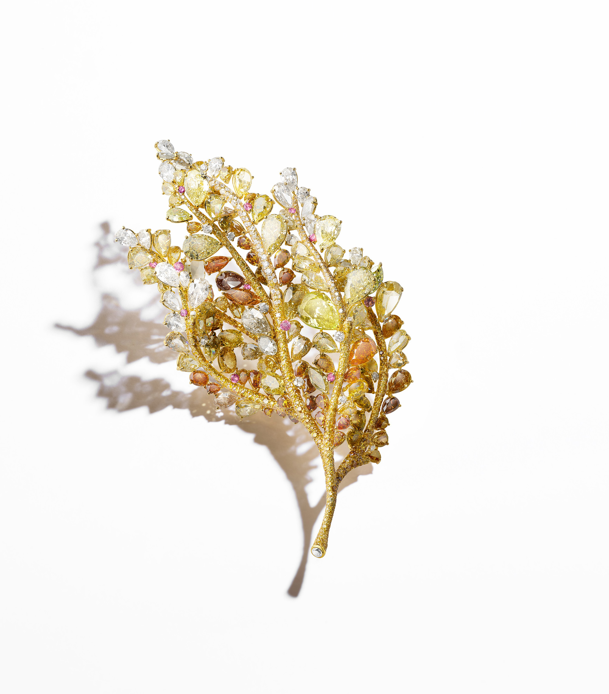 充滿立體感的全新四季系列楓葉胸針,彷彿是Cindy二十年藝術珠寶工藝的濃縮。她親手蠟雕再由歐洲工坊進行金屬鍛造,最終呈現出每片葉子精湛的葉脈與曲面,Cindy甚至特別呈現出楓葉邊緣帶刺的特色。作品在多層次的三葉結構之下,從各個角度展現出楓葉隨風掠過時葉片彎曲的自然姿態,Cindy近年在立體結構上的自我突破也在楓葉胸針油然展現。作品色彩的變化,依然是精細地從上千顆寶石當中,挑選出細微漸層的色調,再密鑲豐富的視覺層次,演繹她對於生命節奏的體悟:楓葉隨著季節由新生至凋零這樣一個時間流轉的詩意。每一個色調都承載時間的痕跡與生命的韻律,也映照並凝鍊CINDY CHAO藝術珠寶精神中濃墨重彩的「生命力」。