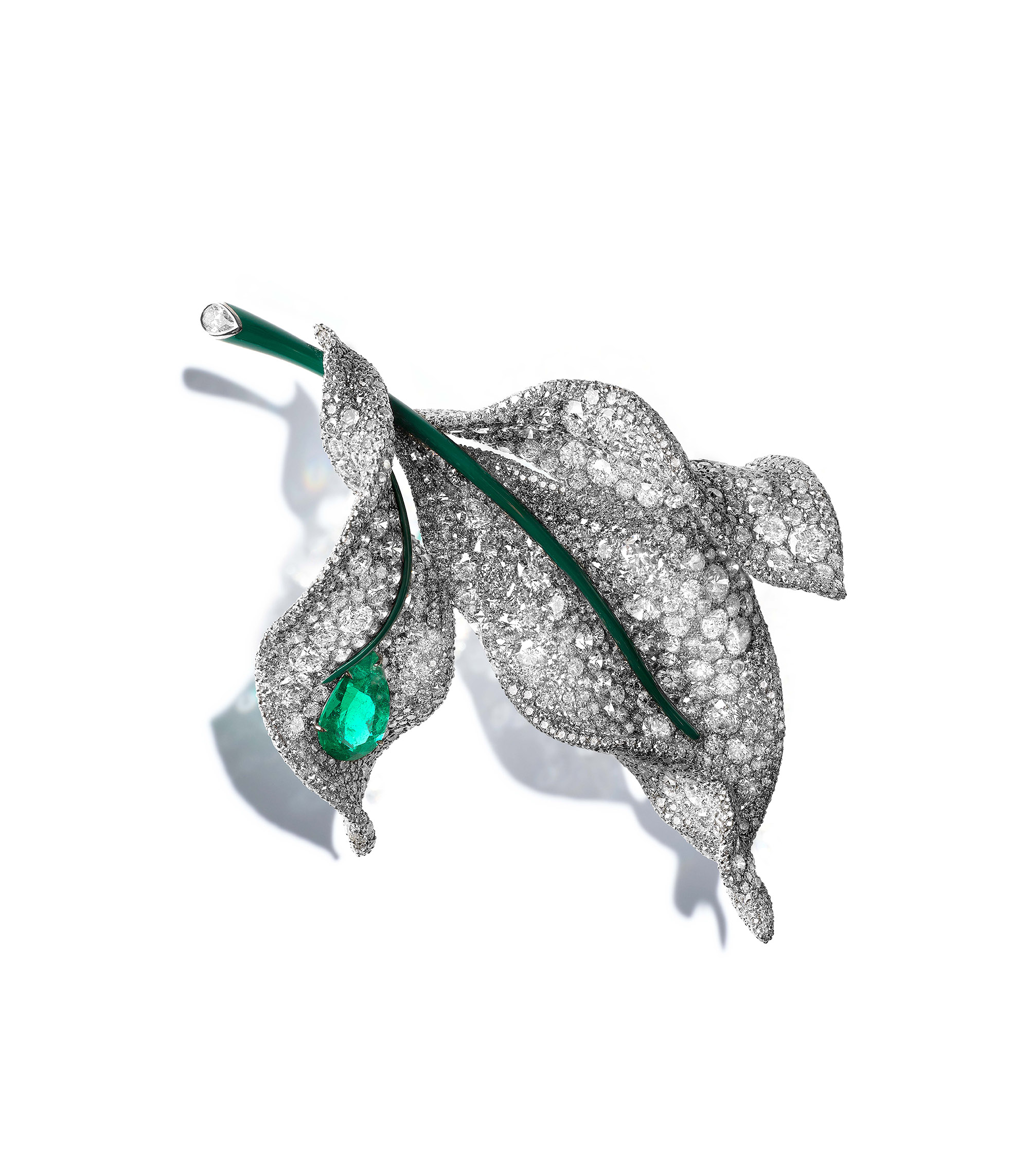 例如綠意盎然的2025大師系列「落地生根胸針」,以多層次的立體結構展現Cindy「建築師思維、雕塑家手藝」的創作理念。葉片精心配置的兩處鏤空,讓這一枚立體結構、層次飽滿的葉片營造出平衡的呼吸感與向下紮根的力量感。並透過顏色細微漸變的寶石層次排列,展現葉片自墜地、生根、萌芽、再到枝繁葉茂的生命循環。寶石包含白鑽、祖母綠、黃鑽、沙弗萊石、偏灰綠色藍寶石、藍寶石、翠榴石,展現在時間流逝當中一片葉子上顏色的細微漸變,而數枚水滴形祖母綠能夠微微顫動,演繹嫩芽初生時刻的靈動生命力。