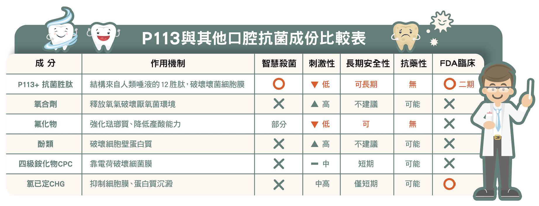 相較之下,來自人體唾液蛋白的抗菌胜肽 P113+,能精準抑制壞菌、保留好菌,維持口腔菌叢穩定,減少感染與發炎。臨床研究證實,P113+ 通過美國 FDA 驗證,可降低牙菌斑、牙齦出血與牙齦炎風險,且無抗藥性,適合長期使用。