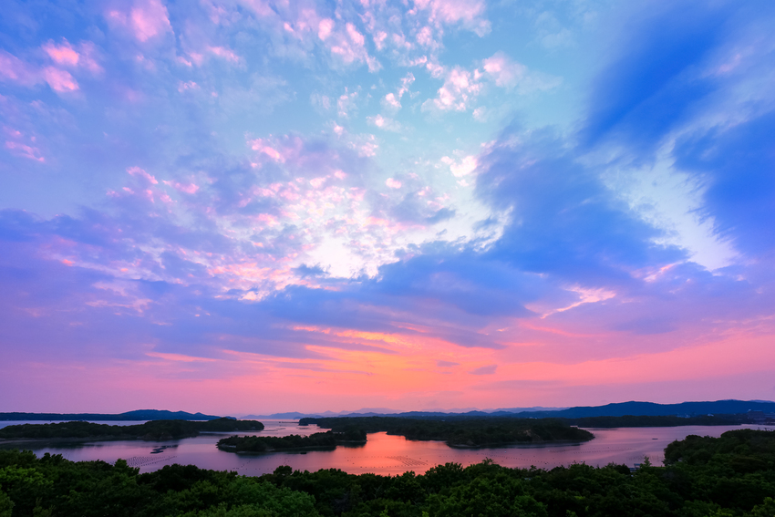 隨著時間與光影的變化,英虞灣的早中晚也會呈現出截然不同的面貌,特別是在日落時分的夕照下,海面上反射出充滿層次變化的光影,天空的色調也從橙紅漸變為紫藍。天色在流轉間繪出浪漫的落日景致,也讓英虞灣的暮色被選為「日本百大夕陽」之一。