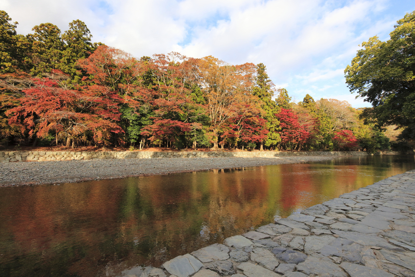 位於五十鈴川上游的伊勢神宮分為外宮與內宮,神宮境內圍繞著古老且寬廣的杉木林,名為神宮之森,與流經林間的五十鈴川,交織出一片靜謐安詳的聖域氛圍,相傳具有淨化身心的神力。