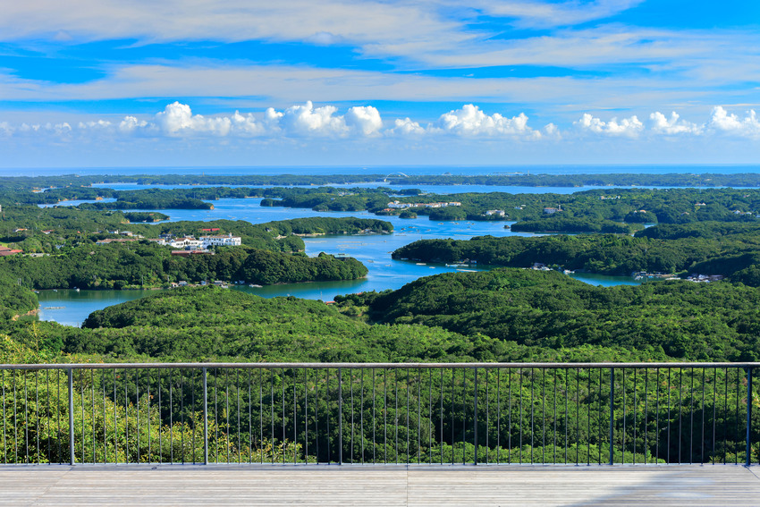 灣內擁有60多座島嶼的英虞灣,是日本珍珠養殖的發源地。從高處俯瞰,蔚藍的海面上散落著大大小小的島嶼,宛如天堂灑落的珍珠,養殖筏在其間穿梭,一旁的海灣曲折秀麗,景色如詩如畫。