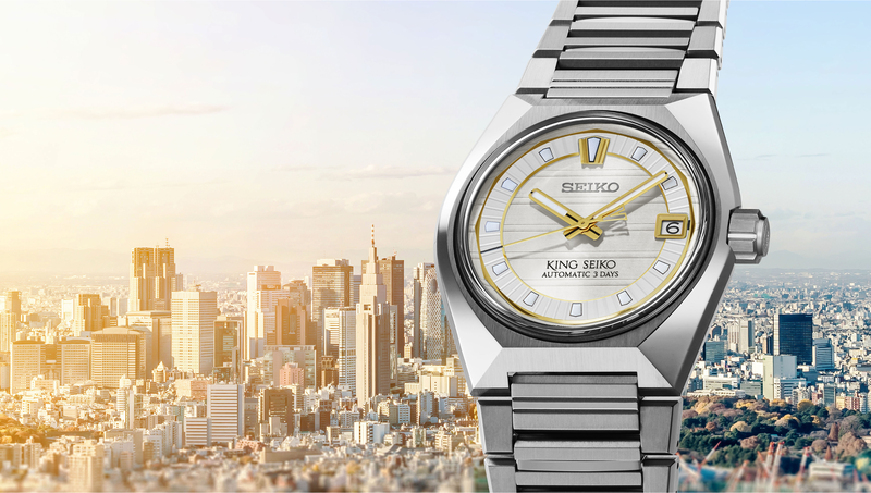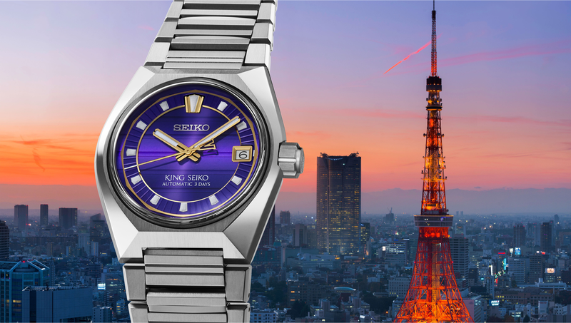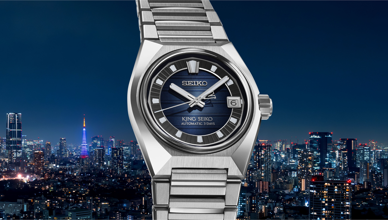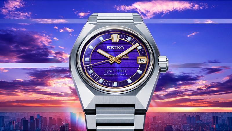 此系列以「東京地平線」為主題,描繪一座與 King Seiko 共生成長的城市,作為錶殼與面盤的設計靈感。介紹三款主色,黃昏紫、午夜藍、日出銀,重新捕捉天光變換的瞬間,其中限定款以金色詮釋「東京日出」的光之盛放,旗艦店版本則以冰藍描摹晴空輪廓,而面盤上細緻的橫向條紋,如城市天際線在時間中緩緩延伸,時標則嵌入獨立的環形結構,使讀時更具立體層次。