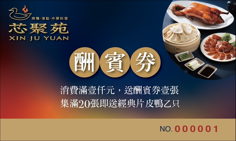 從12月初舉辦為期21天的港點無限享期間限定活動造成市場焦點開始,芯聚苑就讓所謂精緻港點評價往上衝到天花板等級,在新的一年開始也抓緊消費者對餐廳的美食一路好評與延續熱度,陸續將推出午間套餐優惠和下午茶港點限定活動,一月搶先推出芯聚苑感恩酬賓劵優惠活動,絕對可以滿足喜愛美食烤鴨的朋友,來芯聚苑用餐消費滿1000即送一張酬賓劵,集滿10張免費吃到菜單上沒有的主廚私房料理,集滿20張免費吃經典烤鴨乙支活動,希望藉此活動也可讓喜愛美食朋友好好享受芯聚苑推出的道道精緻私房美味與一波接一波的好康促銷。