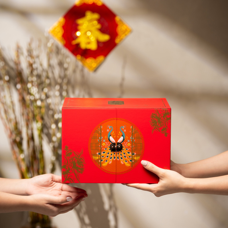大觀園禮盒中心的圓形窗花象徵「圓滿」,對角的燙金牡丹寓意「富貴」,再加上成雙成對的孔雀開屏圖騰,這些元素在商務拜訪時,不僅是視覺裝飾,更是業務員最佳的開場白:「祝您新的一年,如孔雀開屏般吉祥,事業如大觀園般繁盛。」帶有文化底蘊的祝福,遠比一句「新年快樂」有力得多。