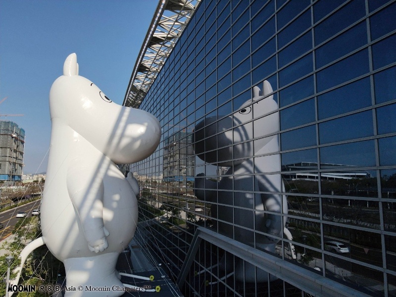 在水湳經貿園區「台中國際會展中心」前,20公尺高的姆明(Moomin)氣偶正好奇望向會展中心,彷彿期待著台中未來的嶄新篇章。不遠處,「台中流行影音中心」以外牆投影形式,讓童話透過科技融入建築,結合燈光讓人感受城市的溫暖與新穎。